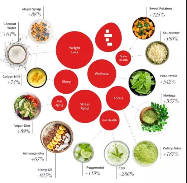 “食品和饮料行业在其中扮演着重要的角色。消费者对清洁饮食尤其感兴趣,“养生”这一社交话题的热度自去年以来增加了40%。去年,思慕雪和草本茶有了显著的增长。”