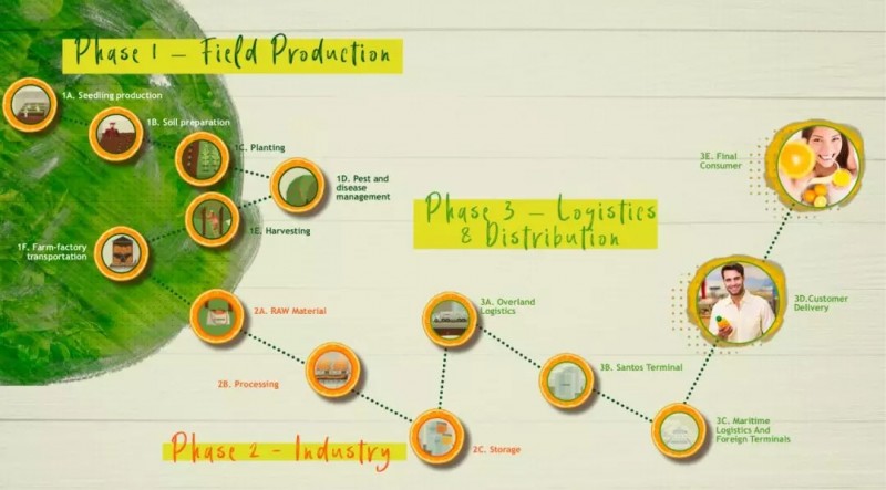 1963年Citrosuco在“巴西甜橙和橙汁主产地” 的圣保罗州成立,经历了60多年的发展,Citrosuco已实现了一条垂直整合的橙汁集成产业链,从培育、种植、采收、质检、再到榨汁、贮藏、运输、销售,可以说,Citrosuco的橙汁经历了从一粒种子到一杯橙汁的完整生命周期。