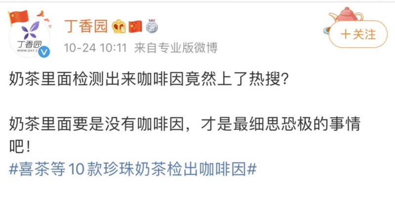 除了李国庆和俞渝的巨瓜,今天的另一则颇有些许视觉冲击力的新闻,应该就是“奶茶中检测出咖啡因”了——