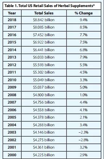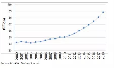 2018年,美国植物膳食补充剂的销售额继续保持高速增长,达到88.42亿美元。与上一年相比,总销售额增长了9.4%,这是二十年来增幅最大的一次。