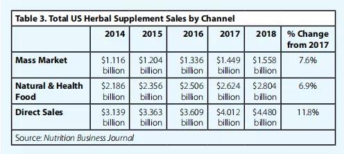 除了植物膳食补充剂的总销售额增长外,2018年所有市场渠道的总零售额都有所增长。最强劲的增长出现在植物补充剂的直接销售,2018年的销售额为44.8亿美元,同比增长11.8%。大众市场零售额增长7.6%,达到15.58亿美元;天然保健品和保健品商店的草本保健品销售额为28.04亿美元,同比增长6.9%。