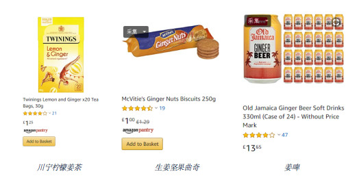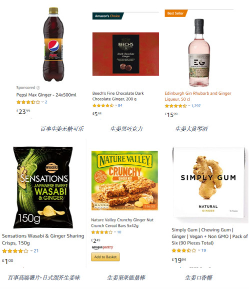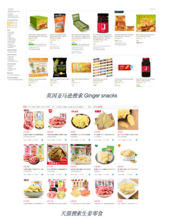 在天猫上搜索关键词姜类零食共有产品262件,但这些产品几乎都是初级包装类产品,姜糖和姜片差不多各占50%。相对而言,亚马逊上搜索ginger snacks(生姜零食)共有489件单品,数量和品类都更加丰富,其中,饼干、能量棒这类在天猫上找不到的产品,在亚马逊上都有多个SKU。