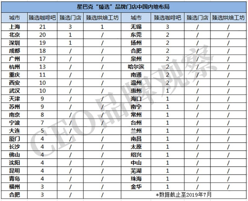 ▲星巴克“臻选”品牌中国内地门店中国内地统计(数据来源:星巴克官网)