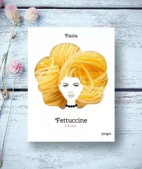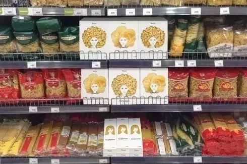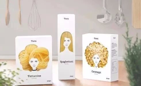 每一款这样的意面包装,上面都是一个典雅女性的形象,只是没有头发,取而代之的是恰到好处的透明窗口——当纸盒中装满面条,这透明窗口就正好变成一头漂亮的金发~必须承认,当这样一个包装放上货架,那视觉效果真的让人过目难忘。