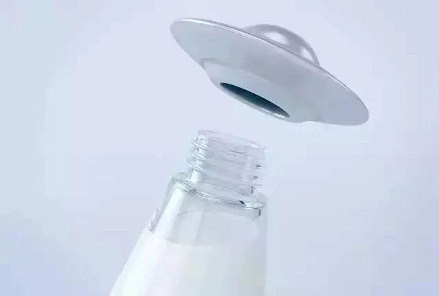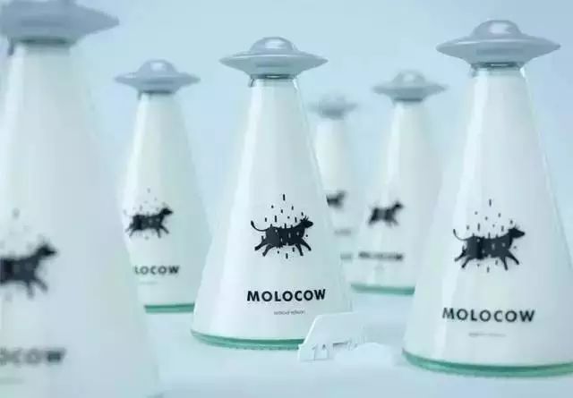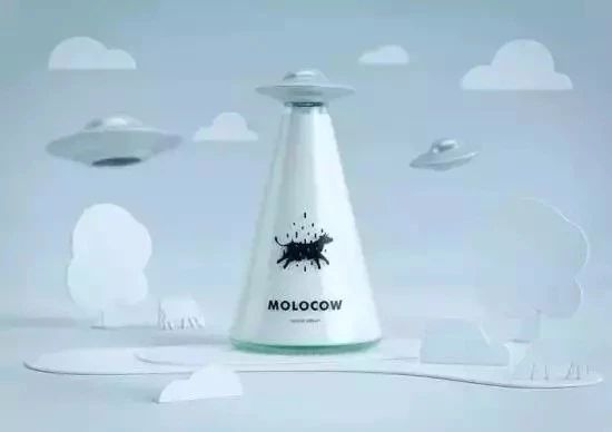 这款牛奶瓶包装通过模拟 UFO 吸走奶牛的场景,打造出一件聚创意与颜值于一身的艺术品。将塑料瓶盖设计成外星飞船的造型,以具有未来感的银色作搭配,显得既别致又科幻。