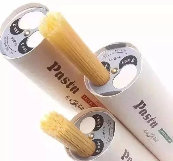 柱状的外形包装能够方便地容纳长直的意大利面,而包装顶部设有两个不同的圆孔出口,小圆孔适合一人份,大圆孔适合两人份,这样既新颖又贴心的设计怎能不叫顾客满意呢?