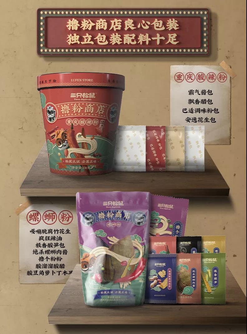 三只松鼠开出的这家酷炫十足的撸粉商店主推两款产品,重庆酸辣粉和柳州螺蛳粉。上线不久,这款产品在三只松鼠旗舰店就迅速突破1万单,同时收获如潮好评,大有成为网红爆品的潜力。
