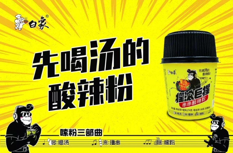 先喝汤,再撸串,后嗦粉。白象推出的摇滚巨猩串串酸辣粉,是对目前方便酸辣粉行业的一个颠覆性的创新产品。产品中单独附白象独有传统熬制的骨汤包,并采用2.2mm宽粉(有别于行业常见的1.0mm宽粉饼),保证100%纯薯类淀粉,爽滑更劲道。同时白象也针对此款新品打造了独特的一个符号IP,用动物界里最具有摇滚力量的猩猩作为形象化的品牌符号,输送给Z世代群体力量、刺激和不屈的摇滚精神。