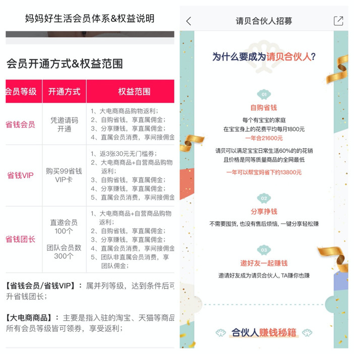 请贝是“合伙人”制,自购199元礼包就成为“合伙人”,自购省钱、分享赚钱。而妈妈好则是“省钱团长”升级制,发动团员购物就能赚佣金。