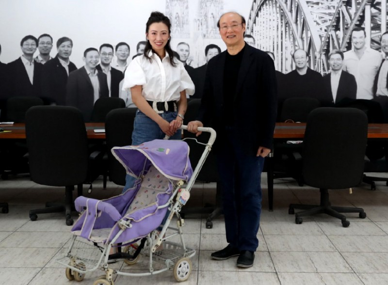 宋郑还与他的女儿在一起,图中童车为好孩子首代产品