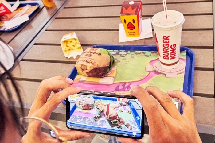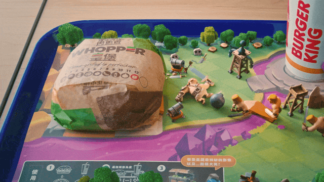 用户只需要把汉堡和可乐放置到餐垫上的指定位置后,用 QQ-AR 扫描就能观看到一段野蛮人之王与汉堡可乐的 AR 动画,跳脱平面的限制,也是让人有点惊艳。