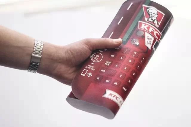 2015 年,德国肯德基观察到顾客深陷吃炸鸡会弄脏手、不便于玩手机的困扰中,于是把餐垫纸做成轻薄的蓝牙键盘连接手机,让你一边享用食物,一边尽情地回复消息,无需担心油腻腻的手会“玷污”手机。
