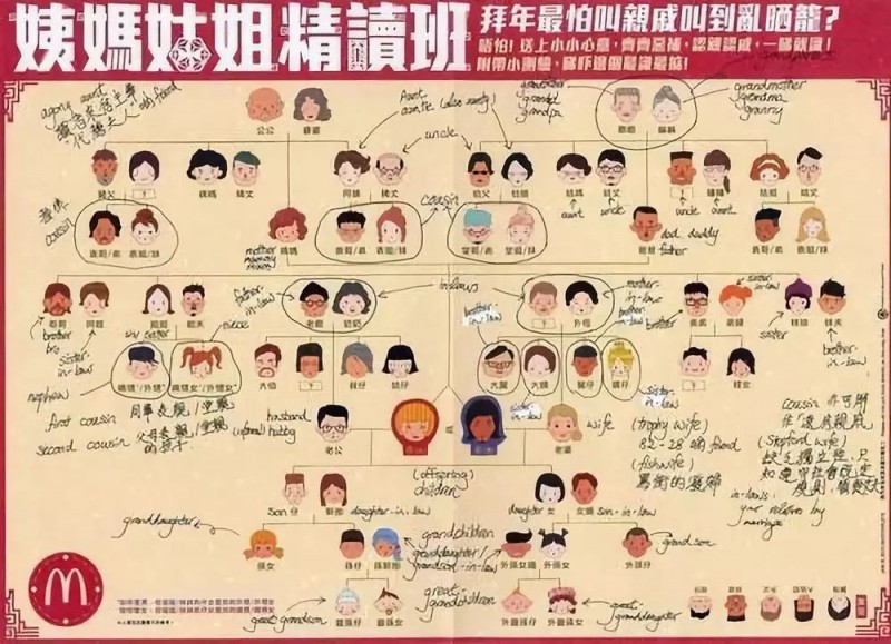 例如香港麦当劳在某年春节,洞察到大众“去亲戚家拜年,却不知道该如何称呼”的普遍现象,推出名为“姨妈姑姐精读班”的一款餐垫纸,说白了就是给你画出家族图谱,手把手教你如何正确称呼亲戚,十分接地气。