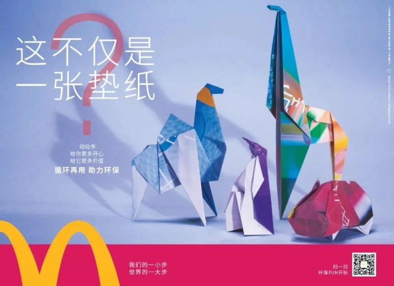 今年 3 月,麦当劳中国也推出了倡导环保消费的餐垫纸,响应其去年发起的“Scale for Good 我们的一小步,世界的一大步”可持续发展行动计划: