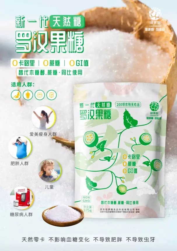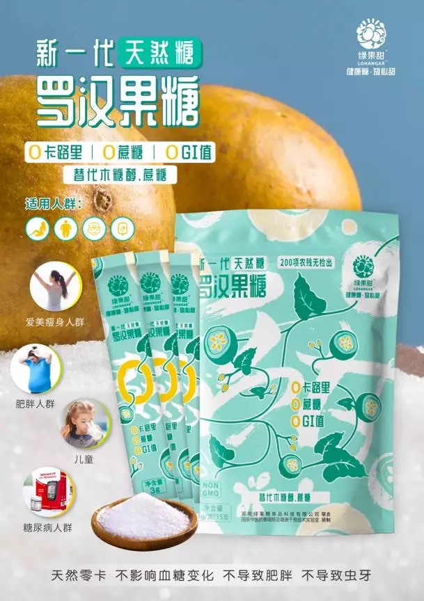 罗汉果应用历史悠久,是中国首批药食两用材料之一,可作为食品,也可作为食品添加剂。天然零卡的罗汉果糖物理提取自新鲜罗汉果果实,口感好,零热量,零GI值,不被人体吸收, 不参与新陈代谢,过量摄入对人体也无影响。罗汉果糖属于非发酵物质,性质稳定,与很多植物复配有非常显著的保健功能,法规添加中无限制添加量要求。罗汉果糖集聚所有天然代糖产品的优点于一身,是糖尿病、肥胖等不宜吃糖者的理想代糖产品,儿童长期食用也不会引起齲齿。