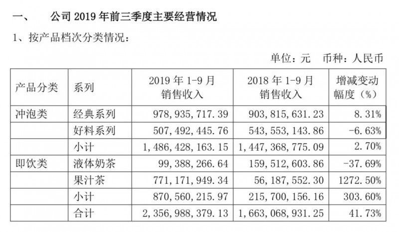 就经营数据来看,冲泡类产品为提升三季度销售收入的主力军。