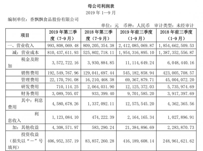 还值得注意的是,香飘飘在2019年三季度的投资收益高达4.06亿元,不仅撑起了三季度的利润总额,也占年内前三季度投资收益的绝大部分,同比2018年三季度投资收益则增加约3.85倍。