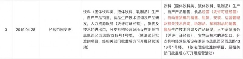 而在今年4月发生的工商信息变更则是一个信号:香飘飘销售路径的转型或将侧重于新零售。4月28日,香飘飘食品股份有限公司的工商信息发生变更,经营范围新增“自动售货机的销售、租赁、安装、运营管理及相关技术咨询”等。