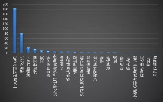 这也与国产保健食品的整体注册现状有关,李庆等人研究发现,2006年-2015年之间,已经注册的国产保健食品功能声称前三位分别是:增强免疫力、补充维生素和矿物质以及缓解体力疲劳。