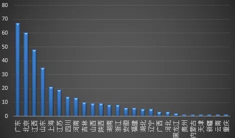 各省份所审批的含甜菊糖苷的保健食品数量不尽相同。其中,广东、北京、江西、山东、上海位列前五,数量分别为67例、60例、48例、35例和21例,占比分别为18.8%、16.8%、13.4%、9.8%及5.9%(注:有3例产品的产地未知,未计算到总数之中)。