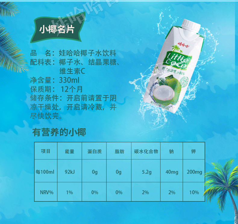 彼时,娃哈哈推出的清透系列,都主打“只比水多一点”,其属性为轻水果味的水。当时,“清透小椰”最大的卖点为“钾元素含量接近100%天然椰子水”,但它并非椰子水,而是一款风味饮料。