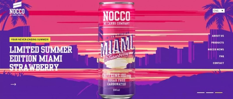 进入到不同季节时,NOCCO会率先推出应季产品。例如在夏季的时候,NOCCO曾在15个不同的国家上新一款时令饮料NOCCO MIAML,它将草莓作为原料,给消费者带去来自迈阿密草莓的独特风味。同时包装也采用了多彩的建筑、摇曳的棕榈、五颜六色的日出等形象,为国内外市场展示迈阿密城市的活力氛围。