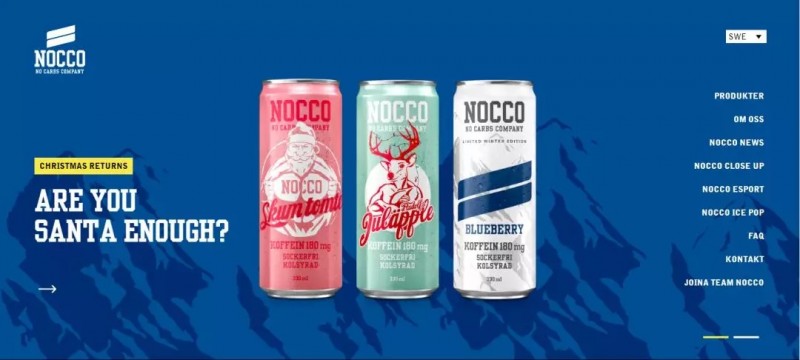同样,NOCCO也在秋季推出了ICE SODA。在冬季圣诞节,除了挂满装饰的圣诞树,圣诞彩灯以外,NOCCO在过去三年分别推出 Skum Tomte、Rudolfs Juläpple 和 Winter Edition Blueberry三款产品。Skum Tomte包装以红色为背景,采用了圣诞老人的经典形象,来迎合圣诞的主题活动。Rudolfs Juläpple包装以淡绿色为背景,图案选取了专门为圣诞老人拉雪橇,长着大红鼻子的驯鹿鲁道夫,让人们深切体验浓浓的节日气氛;此外Winter Edition Blueberry是推出的冬季版本,沿用了过去饮料的设计,以白色背景为底,为消费者在圣诞节时献上节日的祝福。