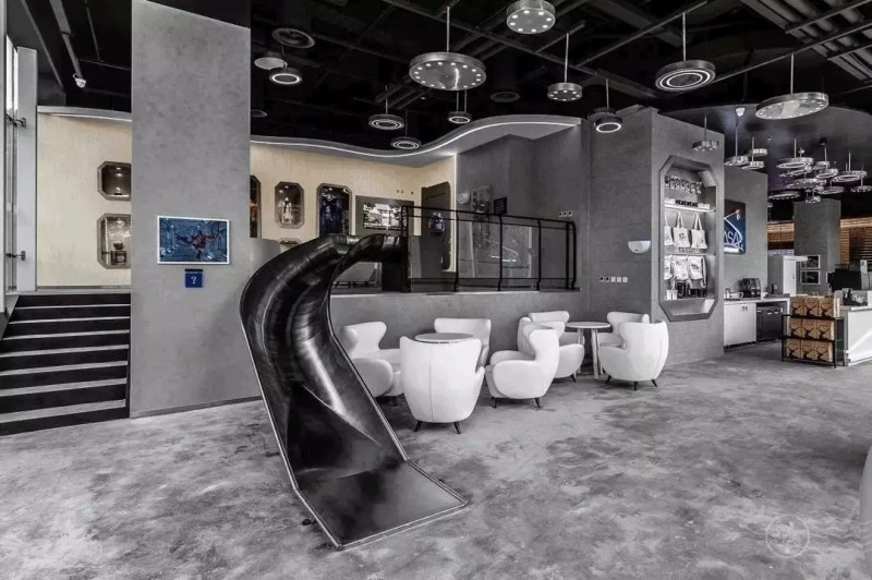 店内还放置了一个黑色太空滑梯让人体验滑行的快感,仿佛作为宇航员置身空间站中去探索外太空,增添了消费者无尽的乐趣和全新的消费体验。