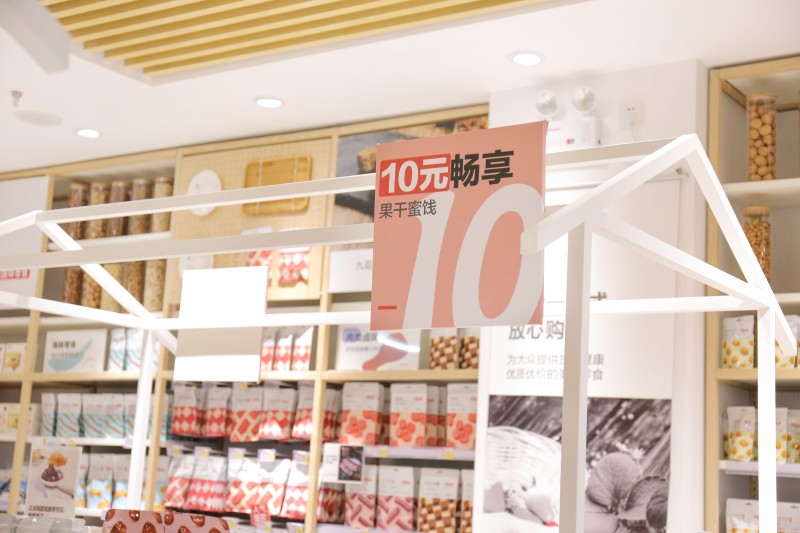 相较于杭州湖滨银泰in77商圈模式的“百草味·零食优选店”,景芳“零食优选店”将10元区扩大,并对动线进行了优化,在专区的陈列上也紧靠健康与便捷,紧抓白领人群需求。夜半小卤专区为晚归的白领提供鲜美卤味;方便速食专区提供多种营养健康速食产品,如百草味的FD冻干牛肉面,味道鲜美酸爽;而礼盒区的“一个礼由”系列产品,则可以帮助忙碌的都市人在归家时为亲人和爱人带去美好的心意……