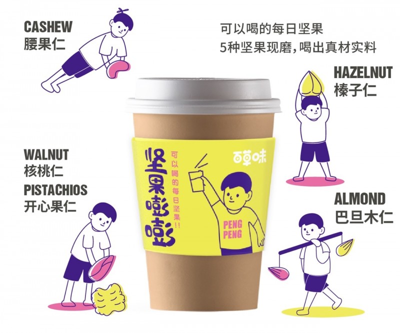 其中,热食区为门店的特色专区,向上班一族提供由百草味创新、为景芳店特供的五种坚果现磨健康饮品“坚果嘭嘭”。“嘭嘭”既形容活力的状态,又是榨汁机研磨坚果时发出的声音。“坚果嘭嘭”将百草味核桃仁、榛子仁、巴旦木仁、开心果仁、腰果仁五种坚果进行现磨制成饮品,饱腹代餐,让白领的每天从一杯真材实料、营养均衡的“坚果嘭嘭”开始,开启新一天的能量和活力。