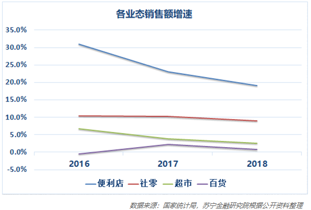 其二,便利店销售额增速领跑线下零售业态。超市、百货等传统线下门店在互联网电商冲击下整体增速放缓甚至负增长,便利店是线下零售行业中唯一保持高速增长的细分业态。在其他业态增长乏力之时,零售巨头期望便利店能够提供新的增速引擎,这是资本纷纷布局便利店的重要原因之一。