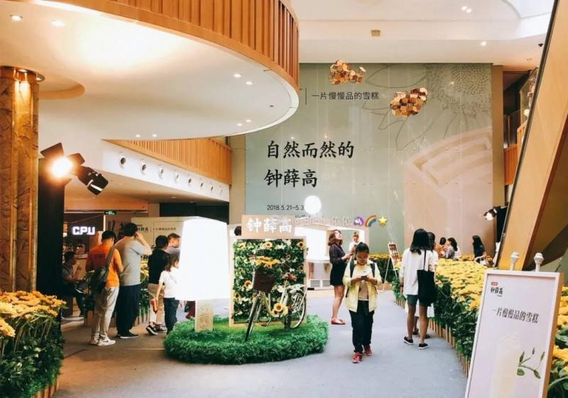 为了获得新用户,降低首次购买门槛,向线上引流,钟薛高曾做过多次快闪店,比如在上海 K11商场的向日葵快闪店,强调新、自然、慢慢品。
