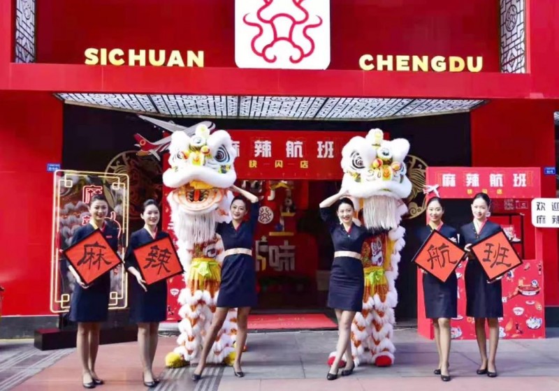 以大龙燚火锅为例,它所做的快闪店,通常非常强调自己的“四川血统”,常用熊猫、辣椒等元素。今年 9 月 20 日,大龙燚与成都航空做了一场跨界快闪,借助“麻辣航班”的热度,再次强调品牌“四川火锅”的定位。