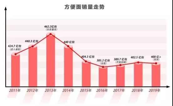 2013年中国方便面销售量为462.2亿包,达到顶峰,随即便逆势下滑,最低滑至16年的385亿包。之后,2017年起开始逐步上涨,2018年,国内22家主要的方便面品牌销售量共计销售400亿包,重回“400亿俱乐部”。