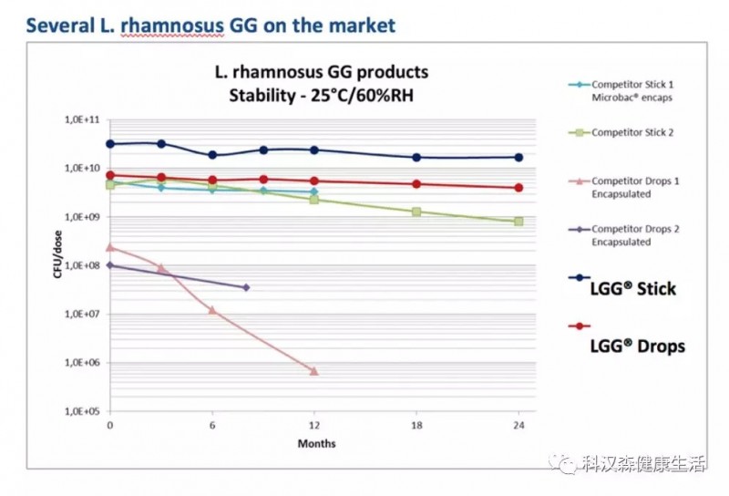附图:市面上某些打着“鼠李糖乳杆菌GG ”旗号的产品货架期稳定性极差,与LGG®鼠李糖乳杆菌相差甚远