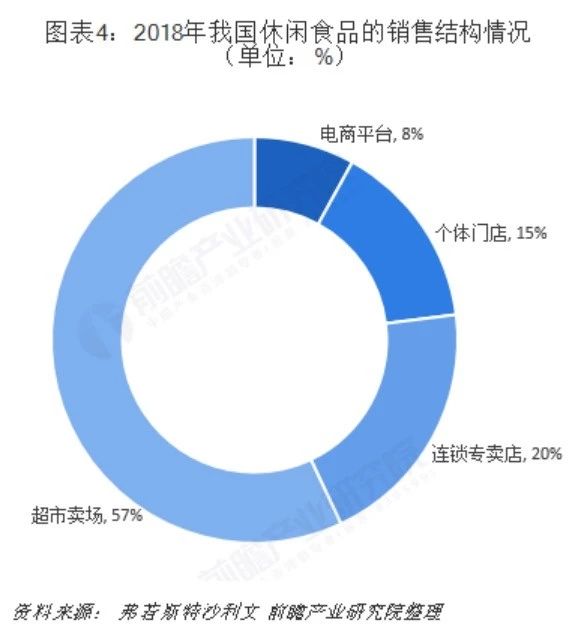 根据Frost & Sullivan的最新统计数据,2018年我国休闲零食的市场规模突破了1万亿(10297亿元),其中超市卖场的占比最高,为57%,而线上购物占比仅为8%。