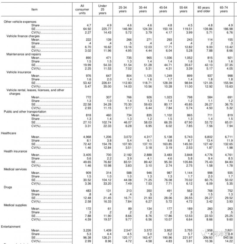 美国居民消费分布(截取部分),来源:U.S. Bureau of Labor Statistics, 2019