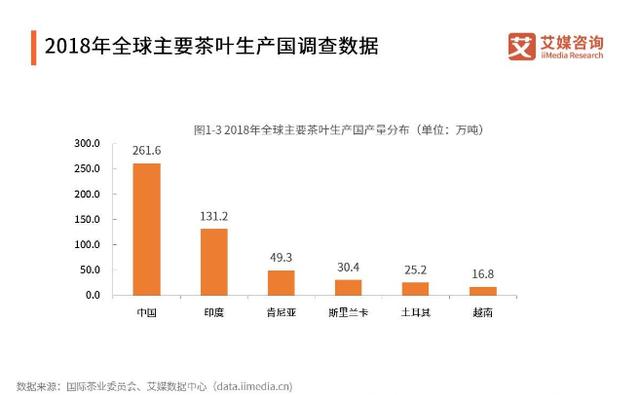 艾媒咨询数据显示,2018年全球茶叶总产量为590.5万吨,其中中国、印度两国的产量已达到67.1%,两国分别贡献了261.6万吨(44.7%)和131.2万吨(22.4%)。受环境气候及经济贸易结构等影响,短期內茶叶生产国的国家变动不会太大,并且随着科技的进步和全球茶叶需求量的进一步增加,主要茶叶生产国的产量仍将保持增长。
