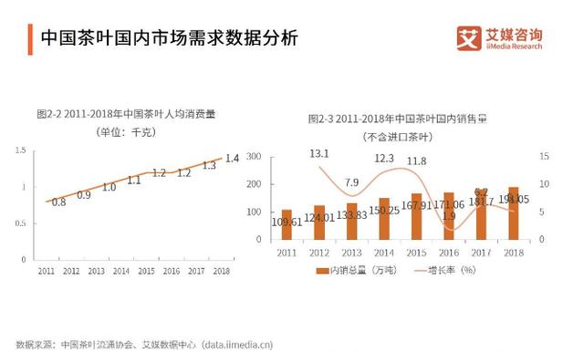 数据显示,中国茶叶的人均消费量不断增加,带动了中国茶叶国内市场的不断扩大,2018年中国茶叶国内销售量达到191.05万吨。