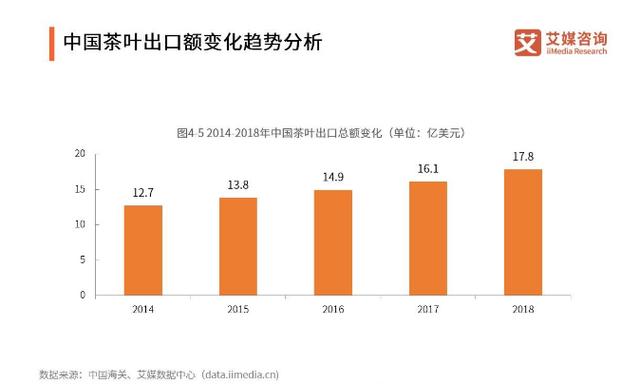 随着中国茶叶出口量的增长,中国茶叶出口总额再创新高,2018年中国茶叶出口总额达17.8亿美元。艾媒咨询分析师认为,由于目前中国茶叶的出口量占比较低且增幅较缓,因此茶叶出口额的增幅也相对不高。