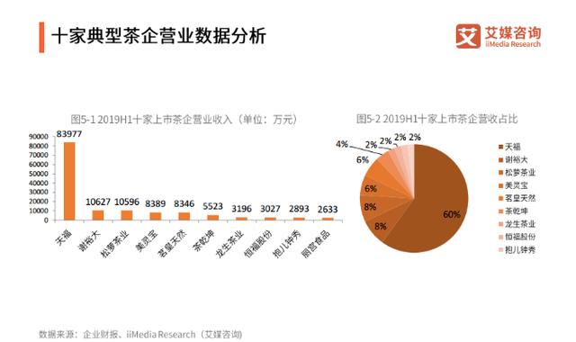 2019上半年,业绩排行前三的中国茶企均超过1亿元关口。其中,天福以83977万元的总营收位列排行榜第一位,且占十大上市企业营业收入的60%,而其余九家上市企业营收占比不超过10%。