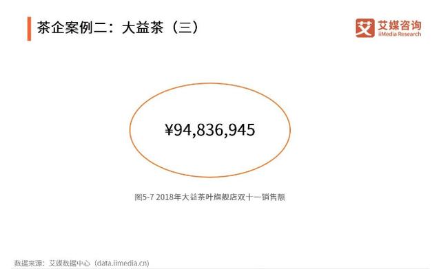 另外,经过多年的品牌沉淀,大益在电商发展方面有一定的成效。2015-2018年大益茶叶旗舰店连续四年为双十一销售冠军。2018年,大益茶叶仅用1小时零4分成交额就达到9484万元,超越了2017年的成绩。然而目前企业开始相对普遍的进行电商传播,大益茶的发展开始面临新的挑战。