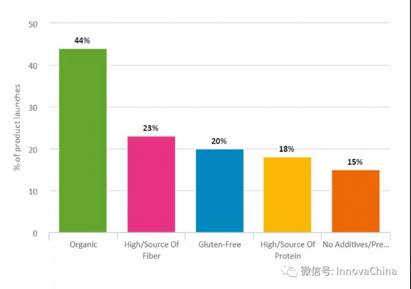 全球范围内,2018年追踪到的含益生菌的包括膳食补充剂在内的食品饮料新品中,领先的前五健康定位分别是有机、高/纤维来源、无麸质、高/蛋白来源、无添加剂/防腐剂。