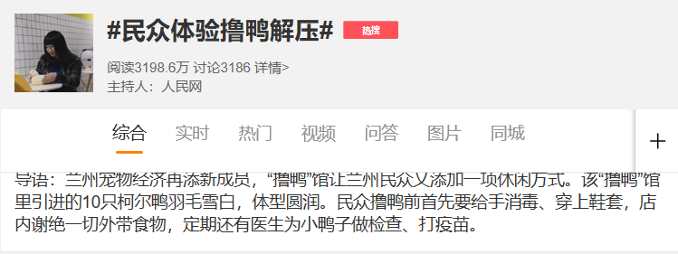 #民众体验撸鸭解压#登上微博热搜 图源:微博截图