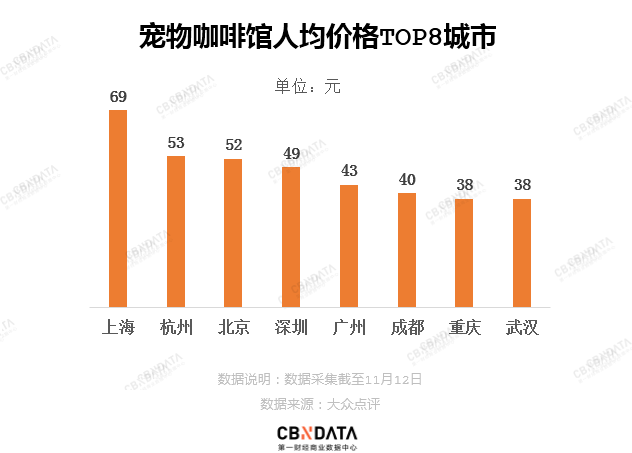 根据大众点评的前端数据,在全国一线和新一线城市中,有三座城市的宠物咖啡馆人均价都超过了50元,比星巴克、Costa等(人均30-40元左右)常见的咖啡馆都要贵一些,宠咖的溢价来自店里的宠物。其中,上海以人均69元高居第一,杭州和北京紧随其后。