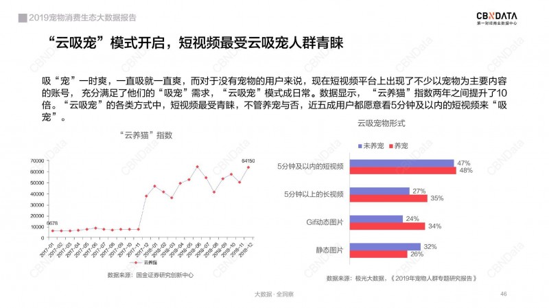 对于没时间或没钱养宠物,但又想撸宠物解压的人来说,“云吸宠”已经成为他们解压的一种方式。根据CBNData发布的《2019宠物消费生态大数据报告》(点击查看完整报告),“云养猫”指数在近两年间提升了10倍,“云吸宠”模式已经成为当代年轻人的日常。