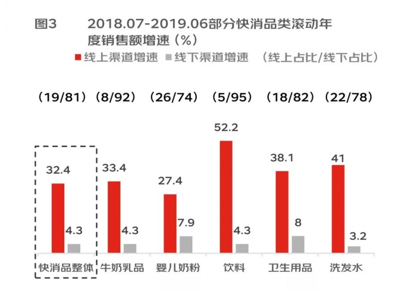 数字化不断改变着人们生活方式和消费方式,品牌商和零售商的渠道布局也在相应调整。尼尔森数据显示:2018.07-2019.06快消品线上销售金额同比增长32.4%,远高于线下4.3%增速,线上渠道成为快消品牌未来竞争主战场。