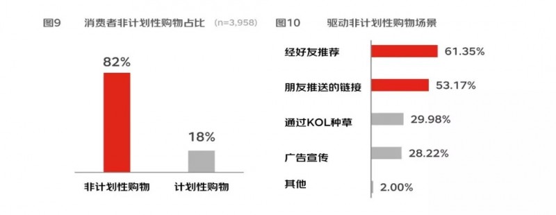 随着中国消费者收入水平的提高以及商品同质化竞争的加剧, 消费者非计划性购买行为的比例急剧上升,据2019尼尔森社交电商深度研究消费者调研数据显示,82%线上购物用户有非计划性消费行为,其中61%用户的非计划性购物行为发生于周围好友推荐,其次是朋友圈产品链接,通过社交裂变产生非计划性购买。