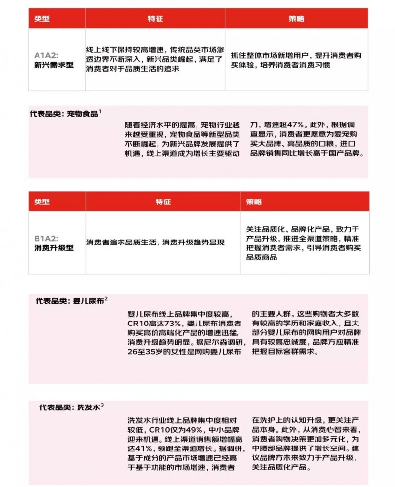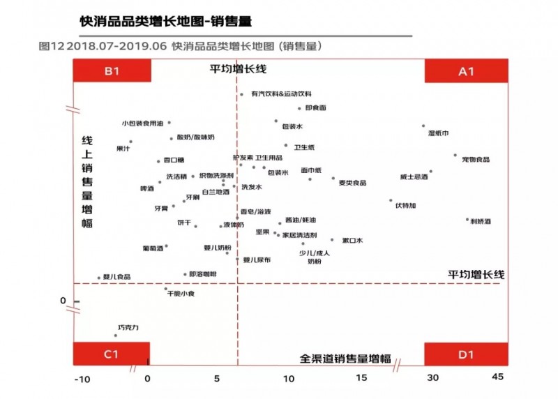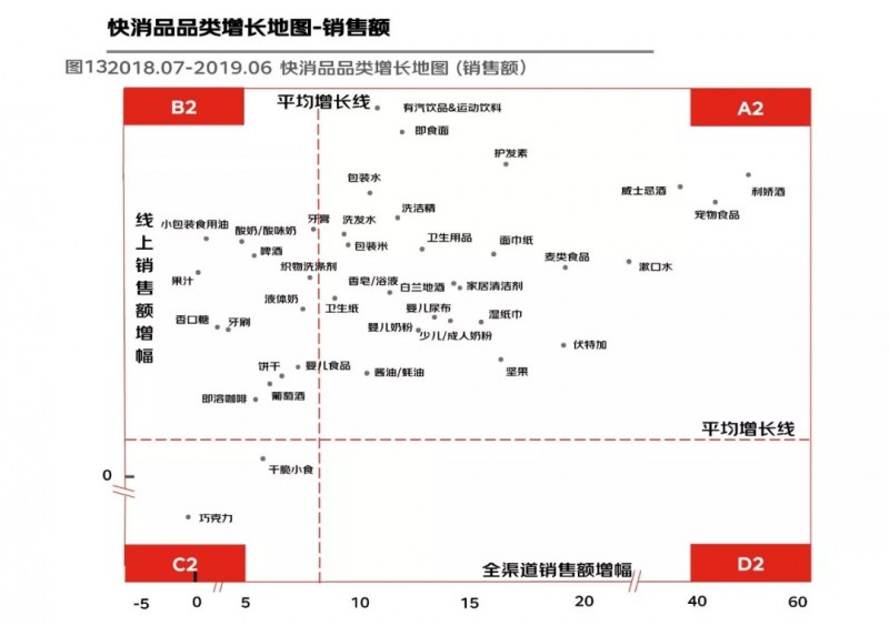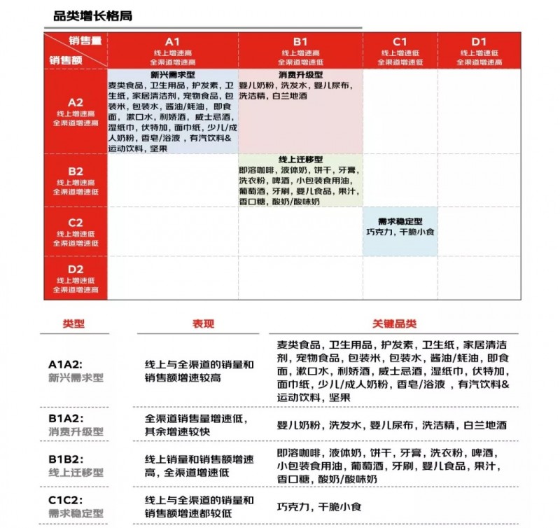 对比销售额的品类增长地图,整体上仍呈现向线上转移的趋势,品类在地图中的分布发生变化,例如婴儿奶粉,从销售量品类地图中B1到销售额品类地图中的A2,表明品类增长的主要驱动因素除了消费需求和渠道之外,同时也受品类升级和涨价驱动。