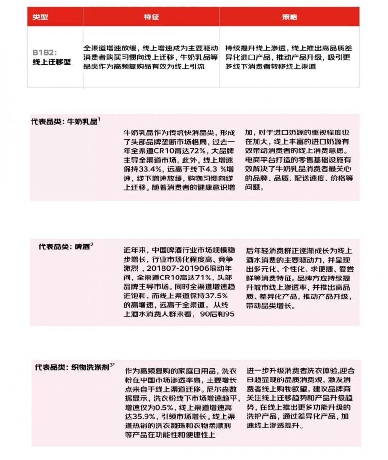 与此同时,品牌商面临部分快消品类增长乏力的困境。据尼尔森监测数据显示,快消品品类全渠道销售额增幅超过线下渠道增幅的两倍,因此挖掘品类线上运营制胜因素对企业而言尤为重要。